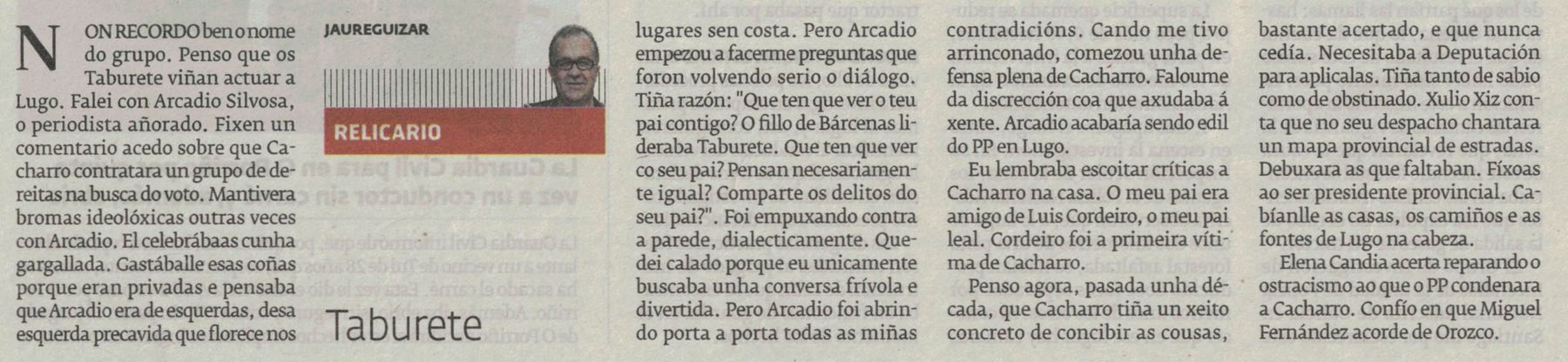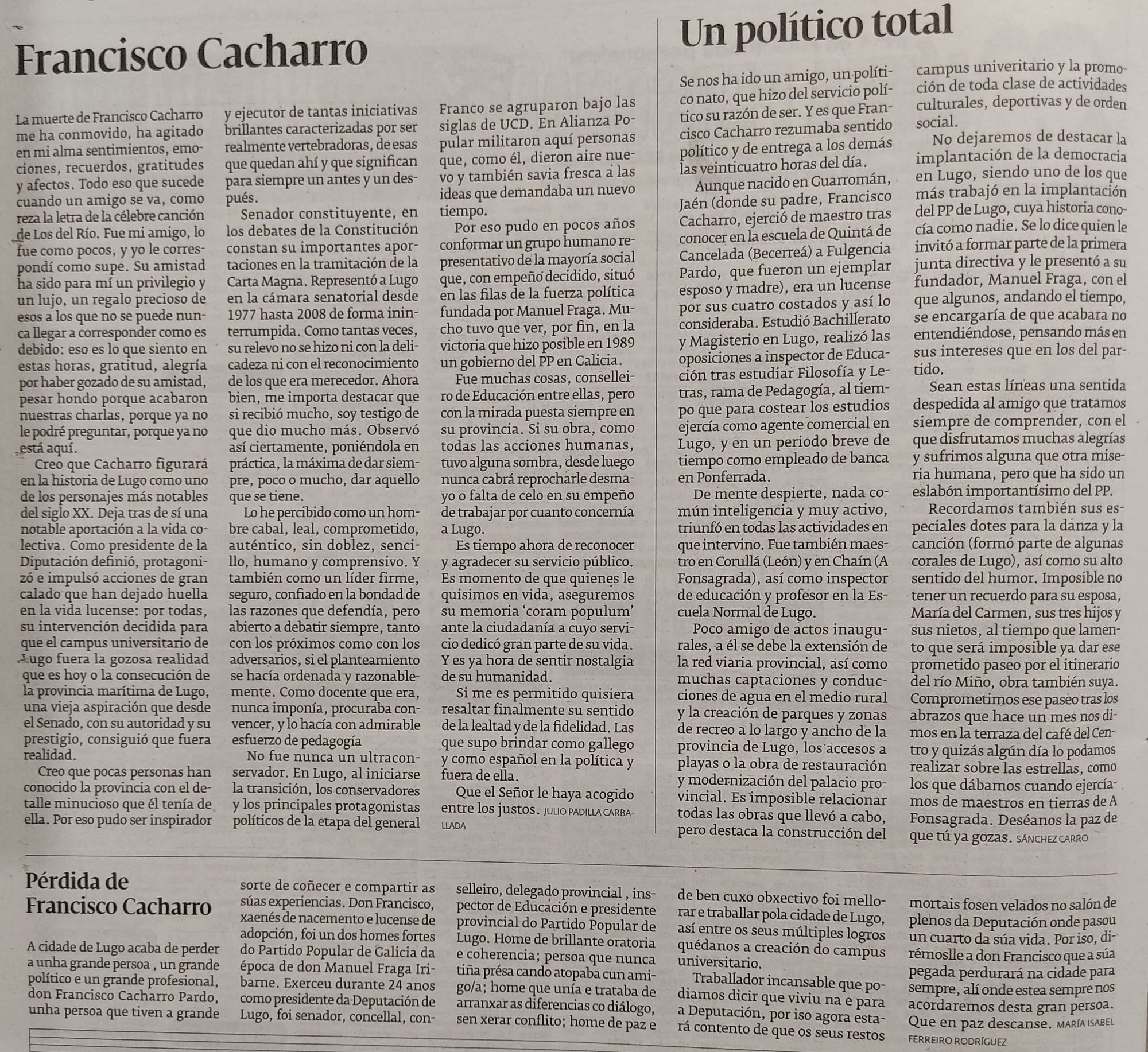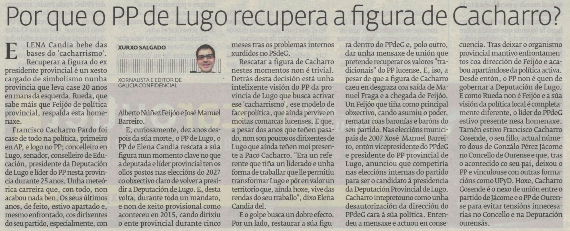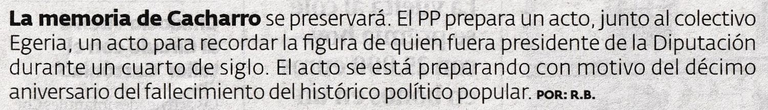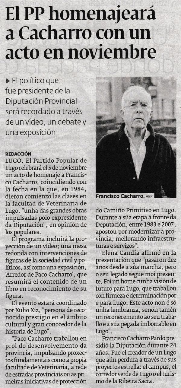 El PP recordará la figura de Cacharro a los diez años de su muerte (El Progreso, 16/10/2025)