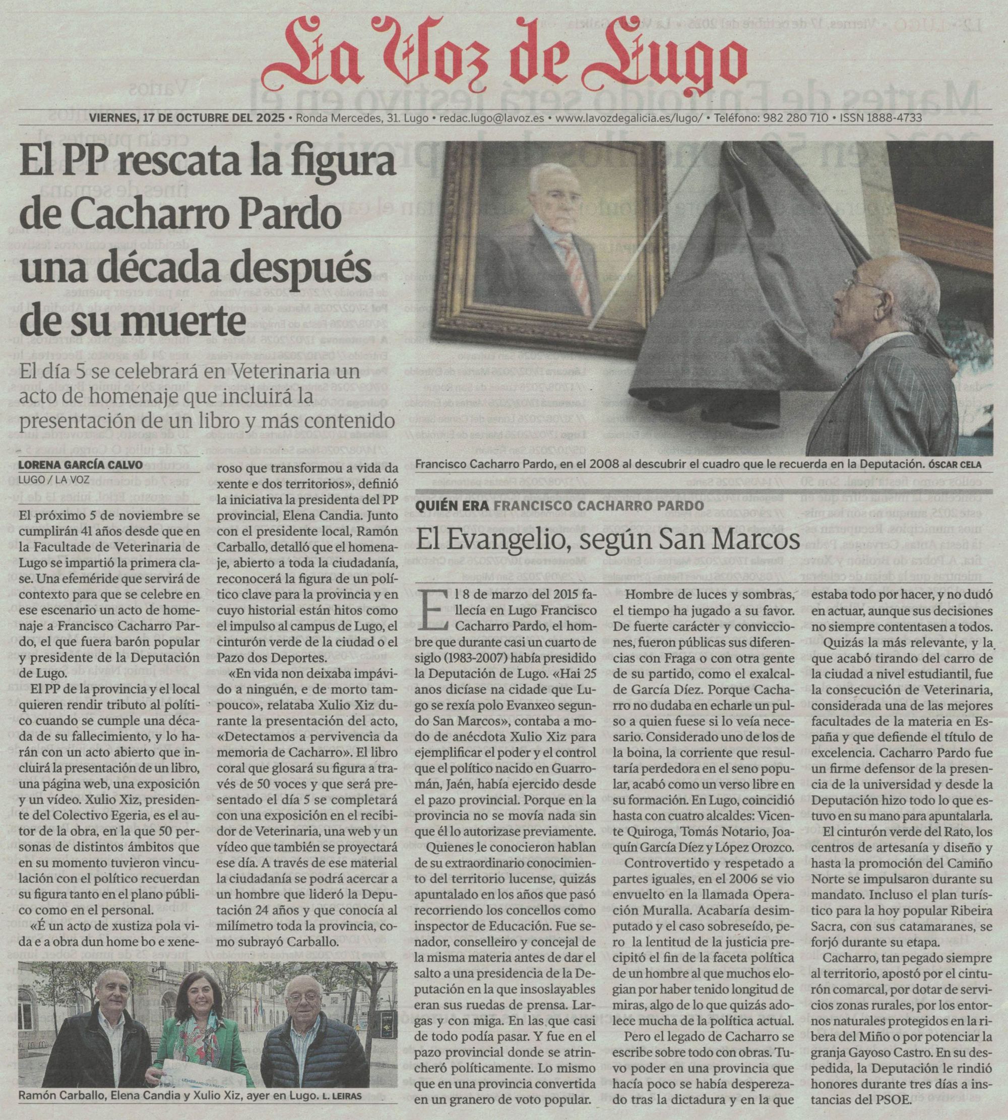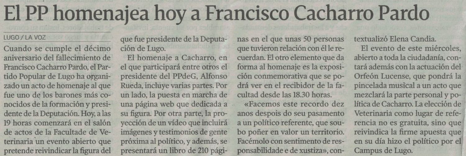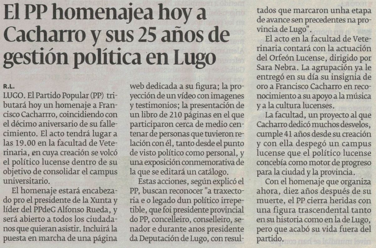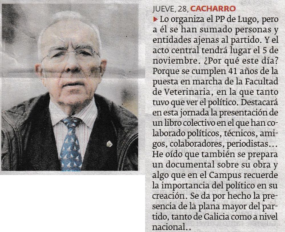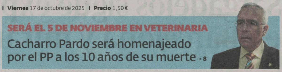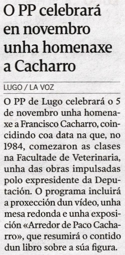 El PP de Lugo rendirá homenaje a Francisco Cacharro Pardo el próximo 5 de noviembre en la Facultad de Veterinaria (Galicia Press, 16/10/2025)
