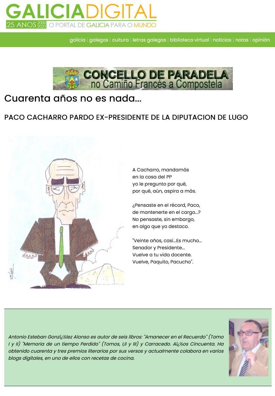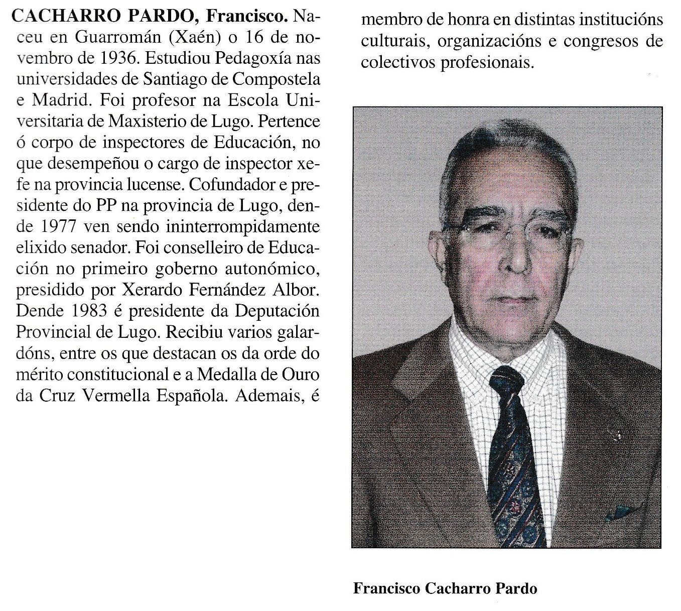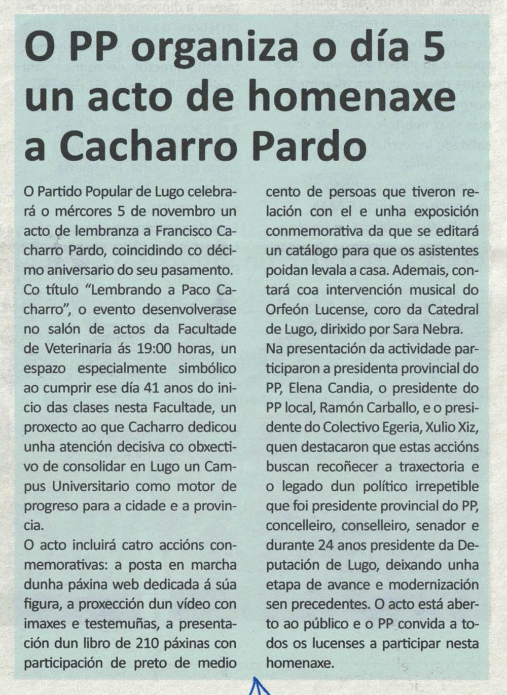 El PP de Lugo rendirá homenaje a Francisco Cacharro Pardo el próximo 5 de noviembre en la Facultad de Veterinaria (Galicia Press, 16/10/2025)