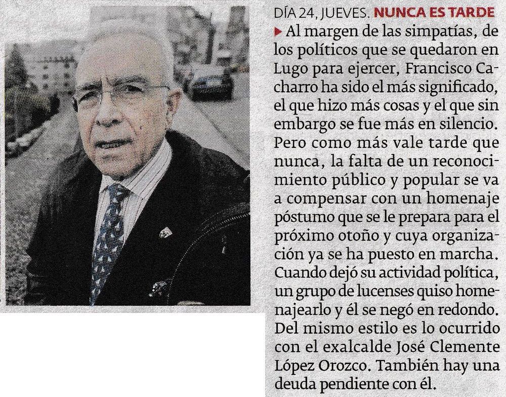 El PP de Lugo homenajea este miércoles a Francisco Cacharro Pardo (La Voz de Galicia, 04/11/2025)