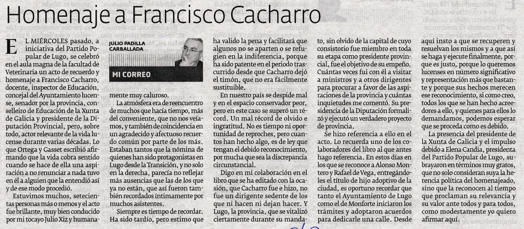 Homenaje a Francisco Cacharro, por Julio Padilla Carballada (El Progreso, 09/11/2025)